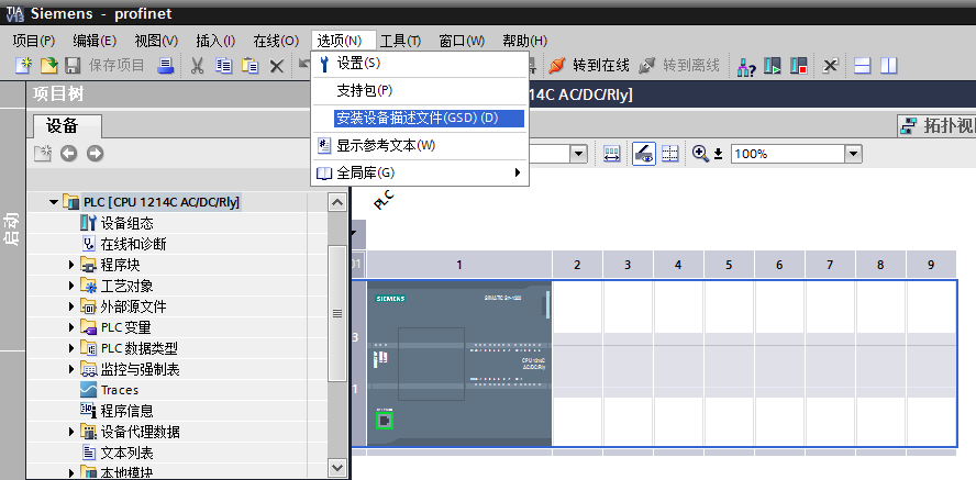 將GSDML文件拷貝入計(jì)算機(jī)硬盤。啟動(dòng)“TIA Portal V13 ”軟件,打開任意工程,在軟件菜單欄點(diǎn)擊“選項(xiàng)”按鈕,在彈出的子菜單中點(diǎn)擊“安裝設(shè)備描述文件”。